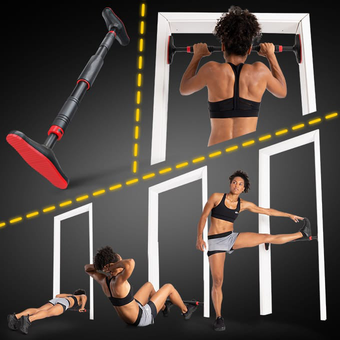 Grâce à son système Easy Use, il suffit de fixer la barre dans l’encadrement de la porte, ajuster la longueur télescopique et la bloquer solidement avec ses pieds en caoutchouc ultra-adhérents.