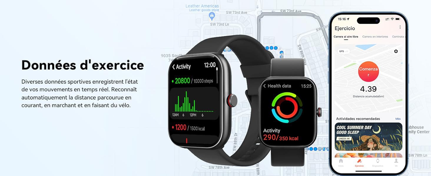 📊 Suivi en temps réel : Distance parcourue, calories brûlées, nombre de pas et fréquence cardiaque.