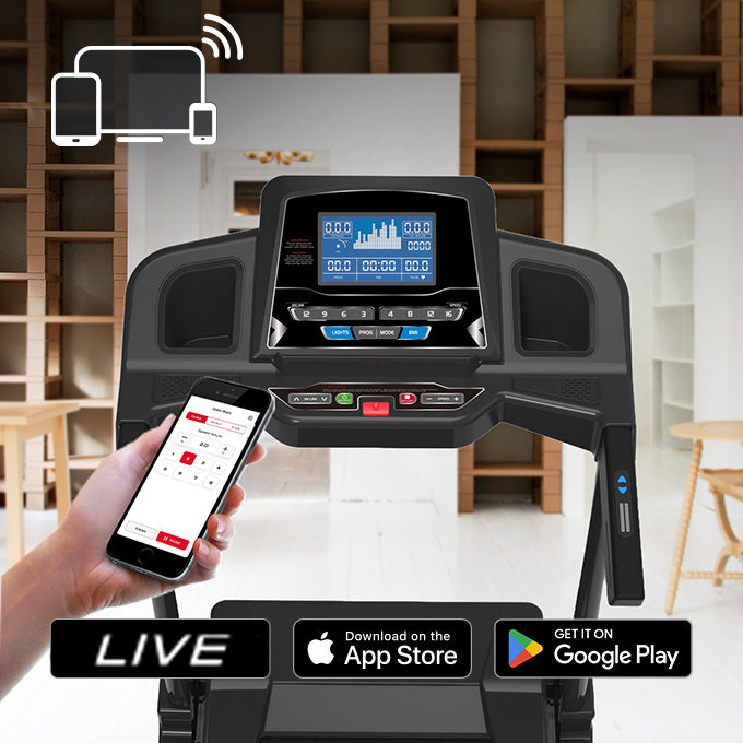 Le tapis de course ProTrack intègre une connexion sans fil, te permettant de regarder tes émissions en streaming pendant ton entraînement et de contrôler ton tapis directement depuis ton smartphone ou ta tablette.