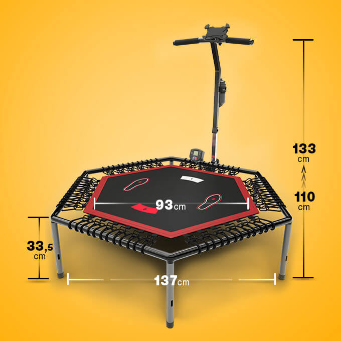 Grâce à sa barre de maintien réglable, tu peux ajuster sa hauteur entre 110 et 133 cm pour un confort optimal selon ta taille et ton entraînement. De plus, son tapis de saut spacieux de 93 cm te permet d’effectuer des mouvements en toute liberté.